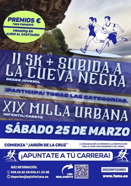 El Excmo. Ayuntamiento de Fortuna, con la colaboración de la FAMU, organiza la XIX Milla Urbana “Villa de Fortuna” y 5K Subida a la Cueva Negra, con salida y meta en el Parque Jardin de la Cruz