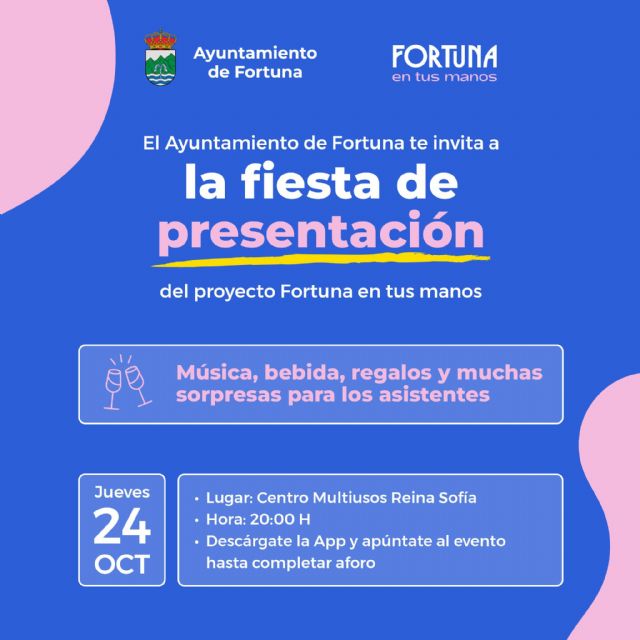 17 Octubre 2024-. El próximo jueves 24 de octubre, de 20:00 a 22:00 horas, el Ayuntamiento de Fortuna celebrará una fiesta de presentación del proyecto "Fortuna en tus manos" en el centro multiusos Reina Sofía. El evento contará con música a cargo de un DJ, bebidas, y decenas de regalos y sorpresas para todos los asistentes.